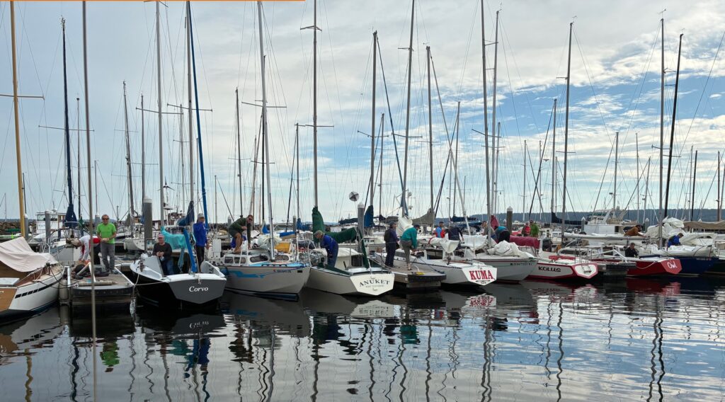 Day 1 included 2 races, held off the Point Hudson Marina in very light conditions. The first start began in light conditions that dwindled to nothing before the first leg was completed. This stopped the entire fleet, except for Gary Davis’s Swan who seemed have their own private breeze wherever they went. Alas, that race was abandoned and the fleet waited for breeze to fill. Eventually there was sufficient wind for 2 races to be held, both of which were won by Fandango.